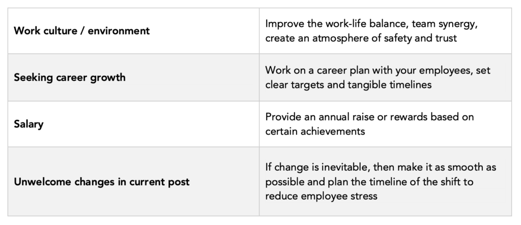In many cases, addressing some of the reasons above can help retain valuable talent for the long-term. Some solutions can be: